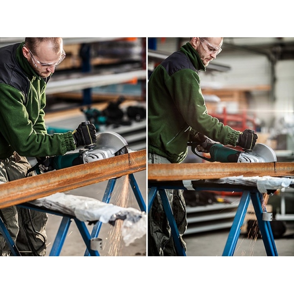 Osłona ochronna zapewnia bezpieczną pracę a szybka wymiana tarcz, dzięki blokadzie wrzeciona, przyśpiesza pracę.