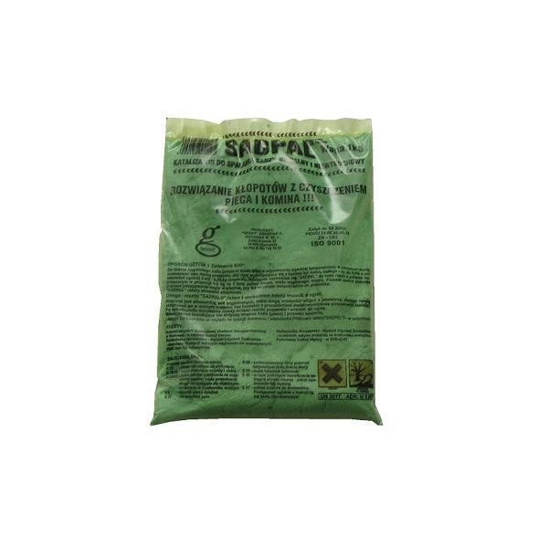 SADPAL" jest zielonym proszkiem - mieszaniną soli nieorganicznych, które w temperaturze powyżej 650°C ulegają rozkładowi na substancje posiadające właściwości katalityczne. Służy do całkowitego dopalania sadzy w każdym miejscu kotła (palenisko, komora spalania, przewody kominowe). Systematyczne stosowanie "Sadpalu" w proporcji 1-2 kg na 1 tonę węgla powoduje likwidację osadów - złogów w piecu i w instalacji grzewczej, utrzymując ich sprawność w okresie grzewczym.